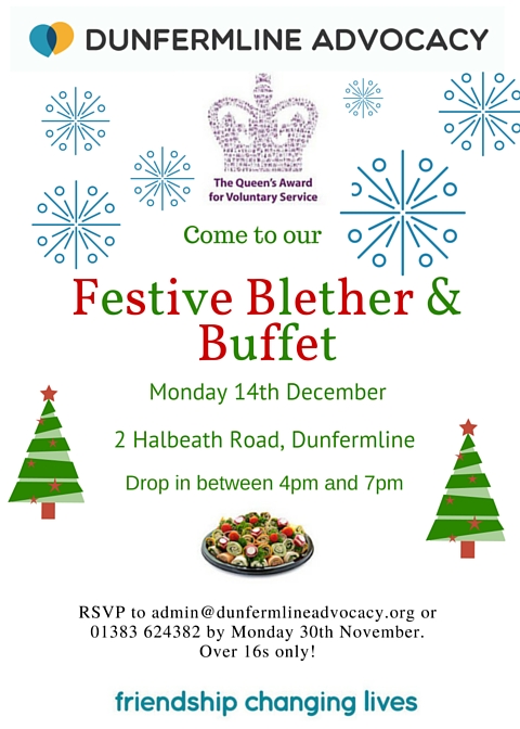Citizen Advocates and Partners in West Fife are invited to the Dunfermline Advocacy Festive Blether and Buffet on Monday 14th December.